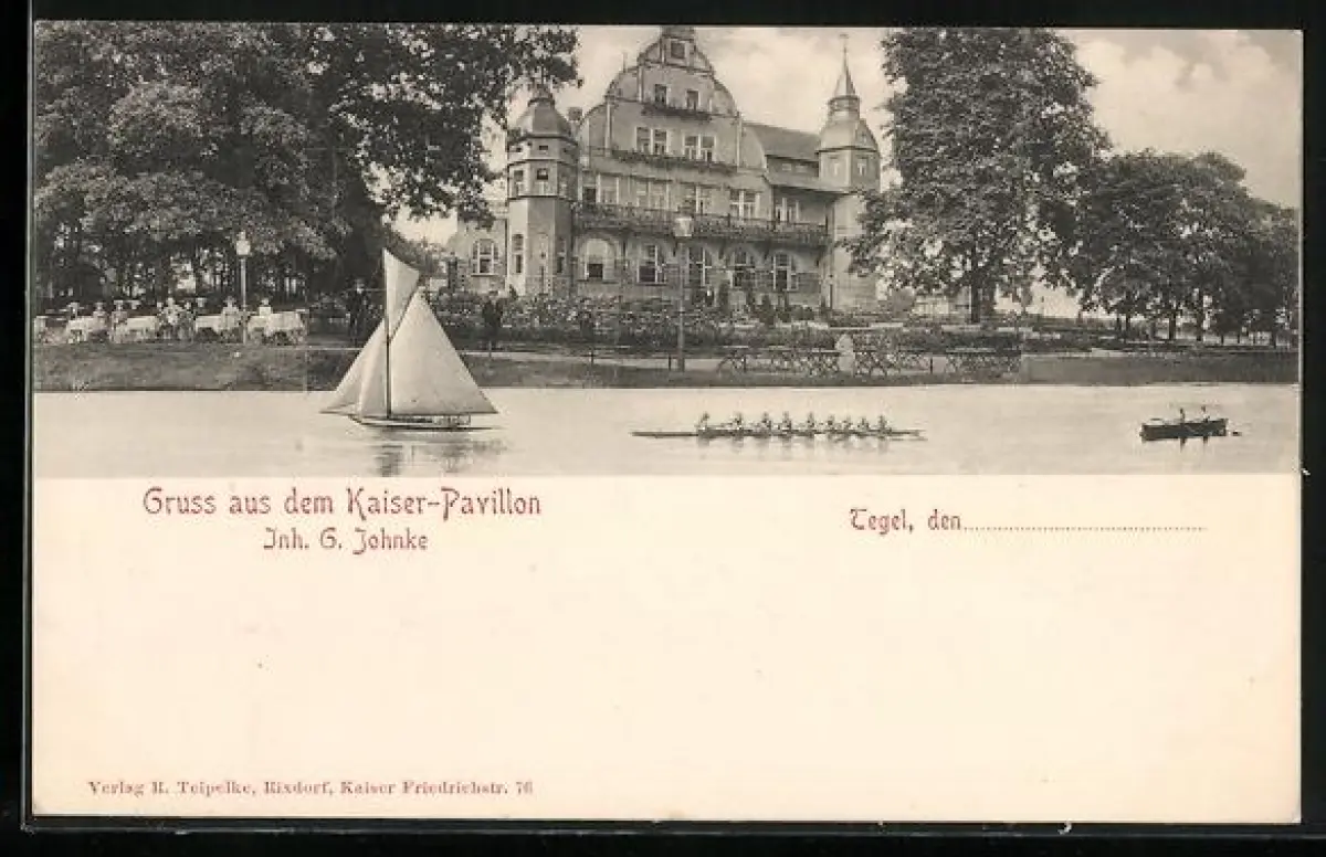 AK Berlin-Tegel, Kaiser-Pavillon, Inh. G. Johnke, Segelboot, Ruderer