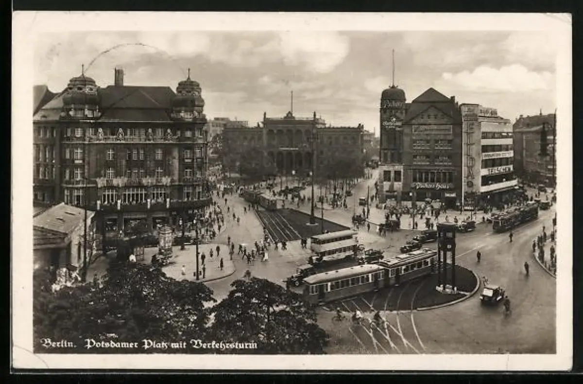 AK Berlin-Tiergarten, Blick auf den Potsdamer Platz mit Verkehrsturm, Strassenbahn