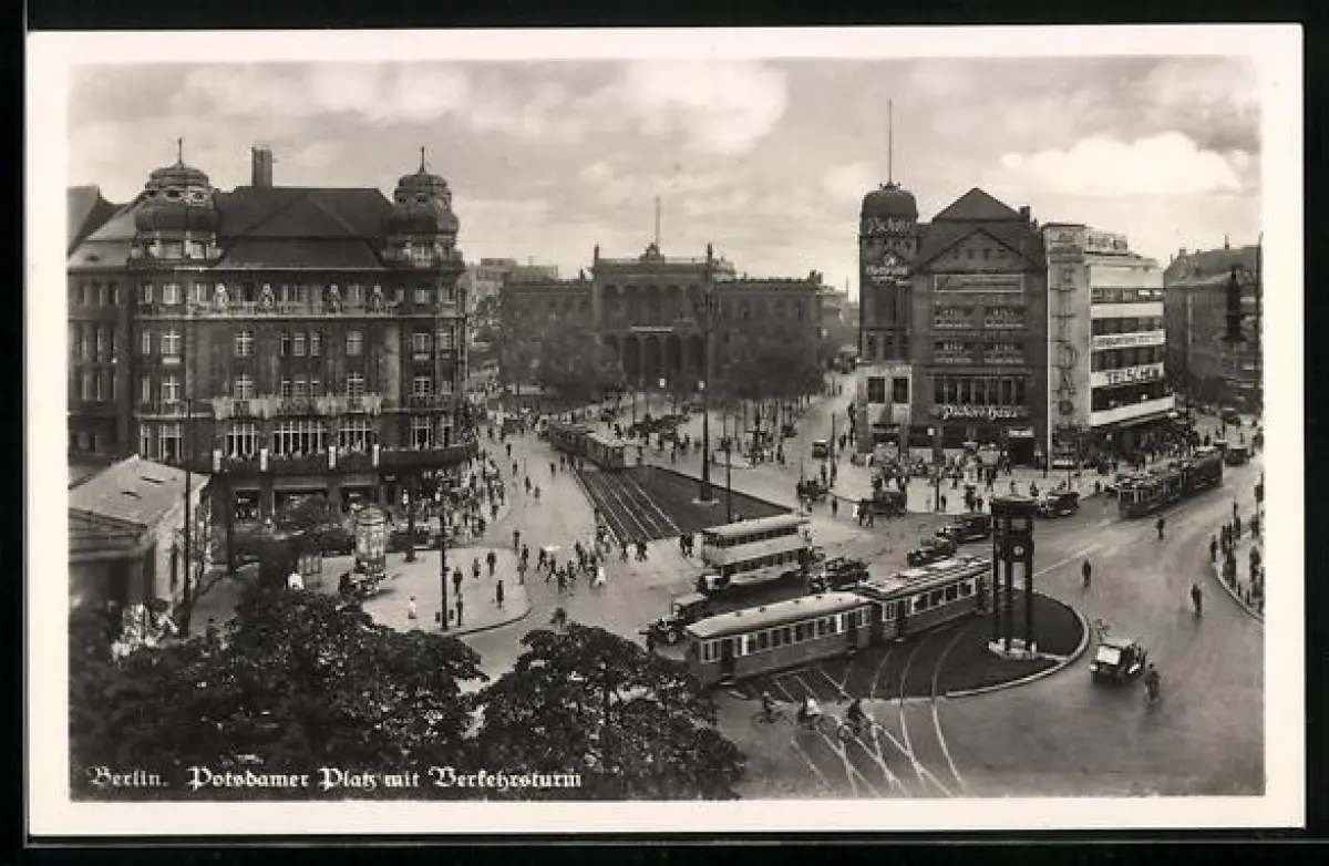 AK Berlin-Tiergarten, Blick auf den Potsdamer Platz mit Verkehrsturm, Strassenbahn