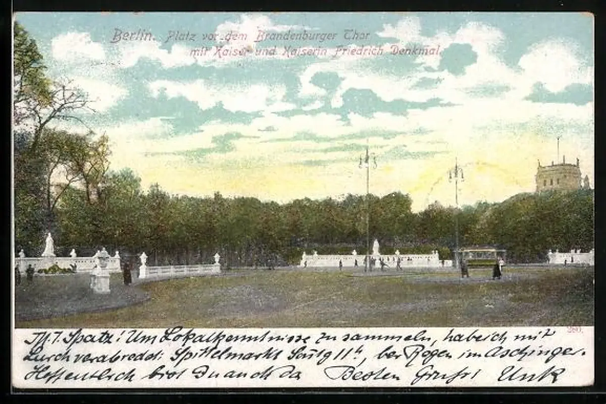 AK Berlin-Tiergarten, Platz vorm Brandenburger Tor m. Kaiser & Kaiserin Friedrich Denkmal, Grosser Tiergarten