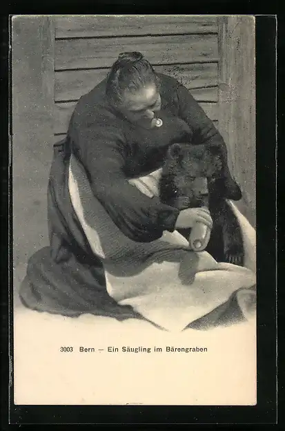 AK Bern, Bärengraben, Bärenjunges bekommt Fläschchen von einer Pflegerin