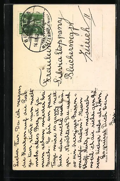 Personenbezogene Daten auf der Rückseite der Karte wurden durch blauen Textmarker unkenntlich gemacht. Die blauen Stellen sind auf die Vorderseite durchgeweicht und wirken sich negativ auf das Postkartenfoto aus
