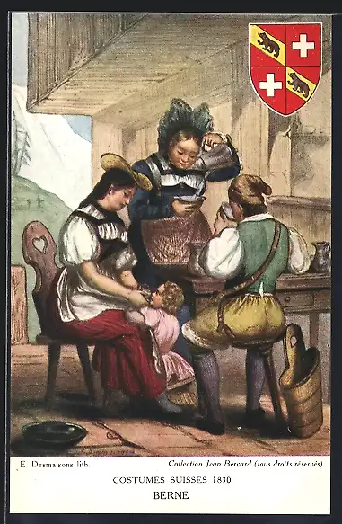 AK Bern, Familie in Trachten um 1830 beim Essen am Tischen sitzend