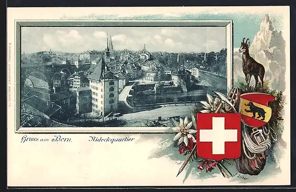AK Bern, Nideckquartier, Passepartout mit Wappen und Gämse