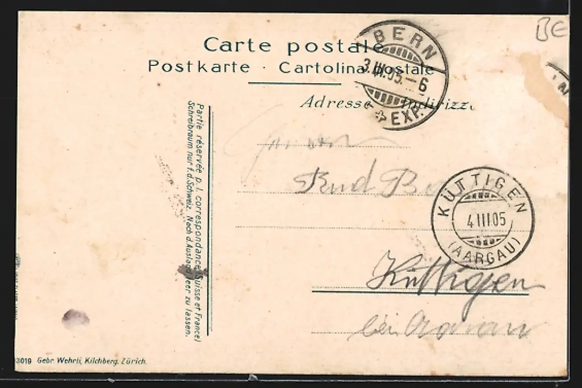 gelaufen 1905, Briefmarke entfernt, rückseitig Oberflächenschaden, Bugspuren li. oben, guter Zustand