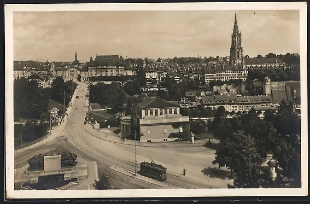 AK Bern, Strassenpartie aus der Vogelschau mit Strassenbahn