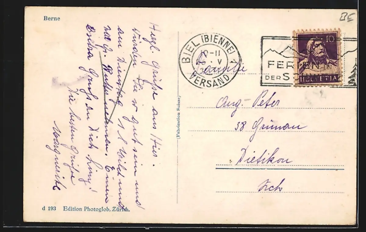 Personenbezogene Daten auf der Rückseite der Karte wurden durch blauen Textmarker unkenntlich gemacht. Die blauen Stellen sind auf die Vorderseite durchgeweicht und wirken sich negativ auf das Postkartenfoto aus