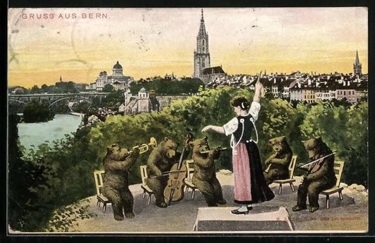 AK Bern, Teilansicht und Frau mit Bärenorchester, vermenschlichte Tiere