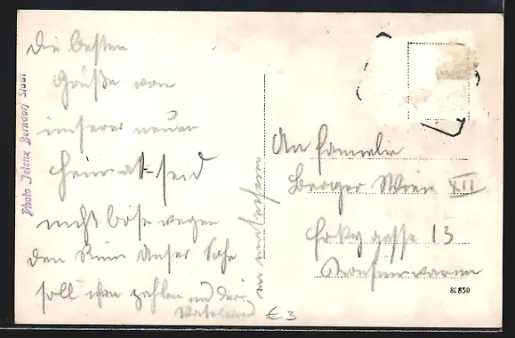Personenbezogene Daten auf der Rückseite der Karte wurden durch blauen Textmarker unkenntlich gemacht. Die blauen Stellen sind auf die Vorderseite durchgeweicht und wirken sich negativ auf das Postkartenfoto aus