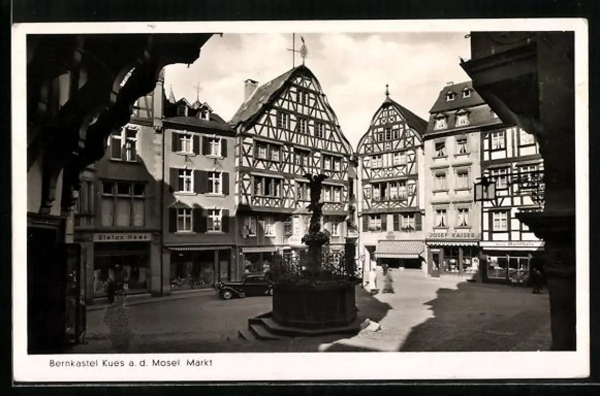 AK Bernkastel-Kues a. d. Mosel, Markt, Fachwerkhäuser, Brunnen