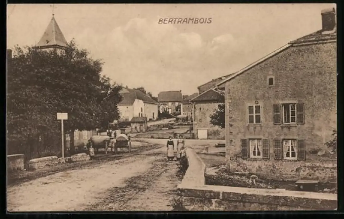 AK Bertrambois, Vue du village avec charrette et habitants sur la route