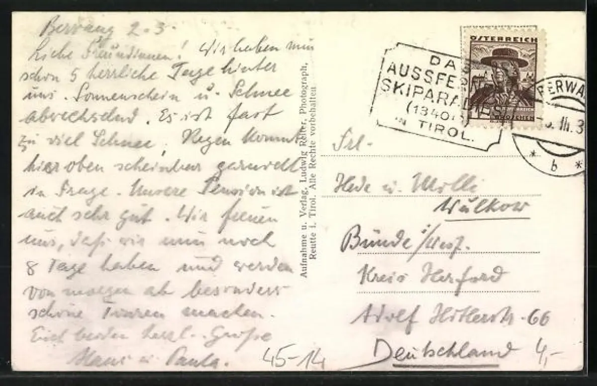 Personenbezogene Daten auf der Rückseite der Karte wurden durch blauen Textmarker unkenntlich gemacht. Die blauen Stellen sind auf die Vorderseite durchgeweicht und wirken sich negativ auf das Postkartenfoto aus