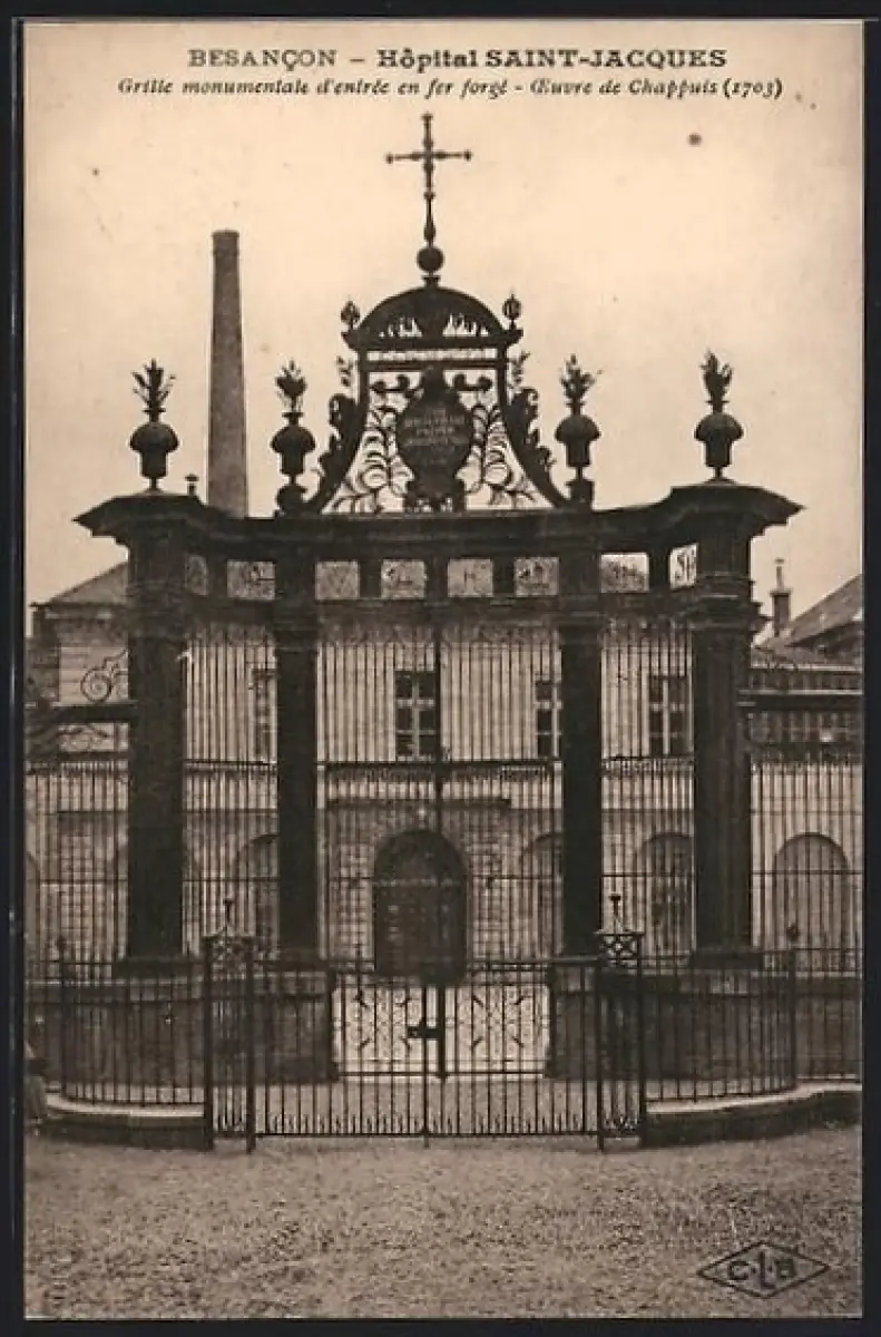 AK Besancon, Grille monumentale d`entrée de l`Hôpital Saint-Jacques en fer forgé, oeuvre de Chappuis, 1703