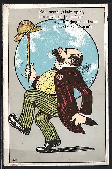 AK Betrunkener Mann balanciert seinen Hut auf seinem Gehstock