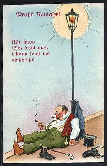 AK Betrunkener Mann schläft an einer Strassenlaterne