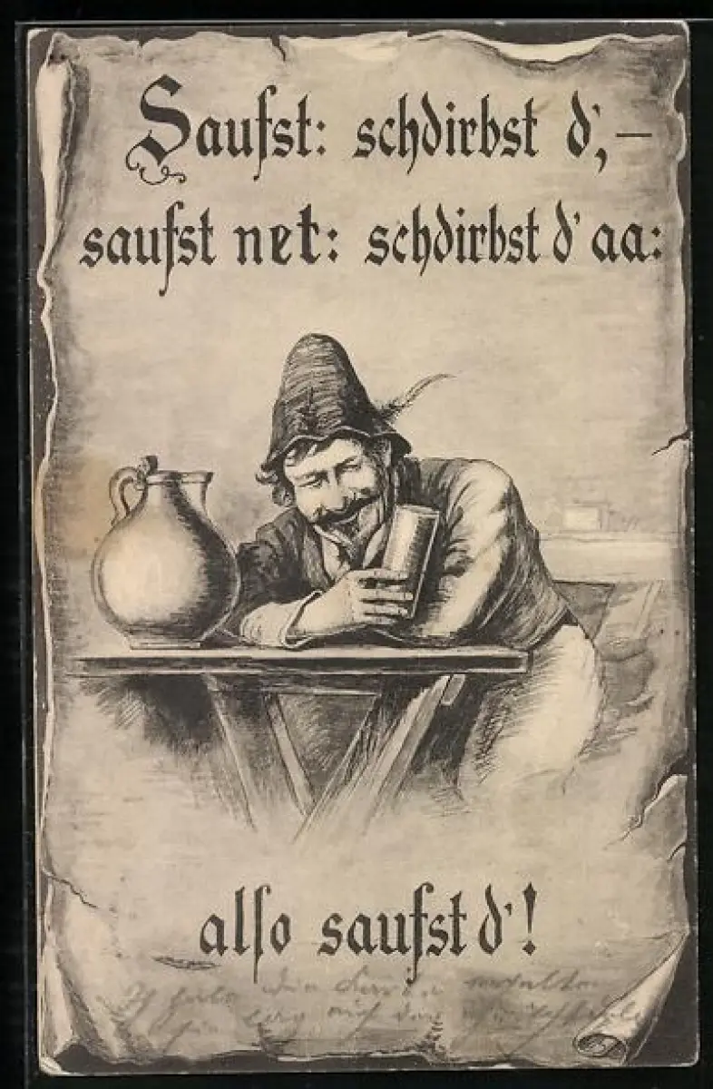 AK Betrunkener sitzt im Wirtshaus, Saufst schdirbst d`, saufst net schdirbst d` aa, also saufst d`, Trinkerhumor