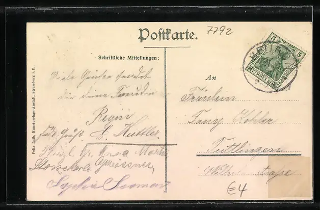 Personenbezogene Daten auf der Rückseite der Karte wurden durch blauen Textmarker unkenntlich gemacht. Die blauen Stellen sind auf die Vorderseite durchgeweicht und wirken sich negativ auf das Postkartenfoto aus