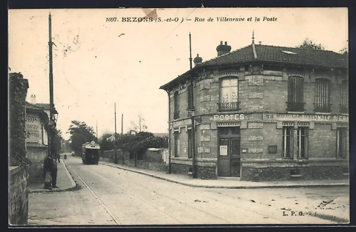 AK Bezons /S.-et-O., Rue de Villeneuve et la Poste, Strassenbahn