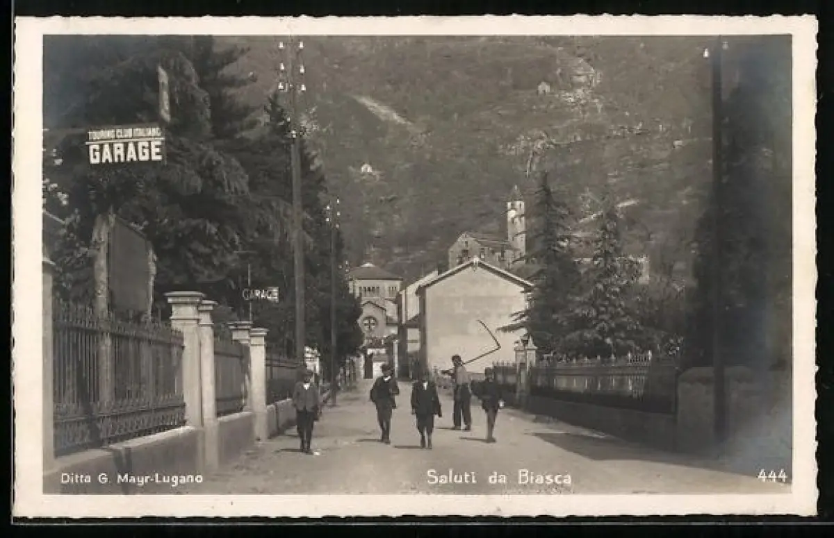 AK Biasca, Strassenpartie mit Touring Club Italiano Garage und Kirche