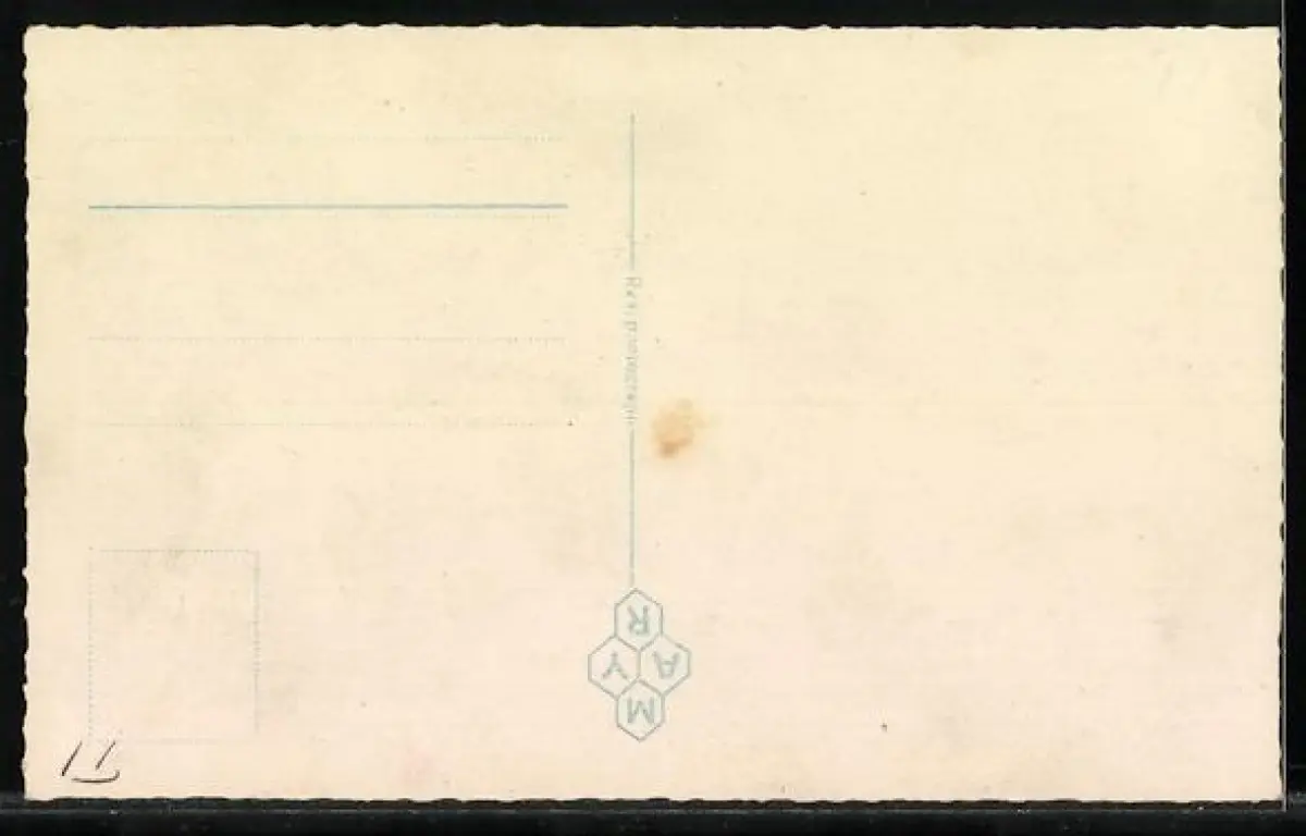 Personenbezogene Daten auf der Rückseite der Karte wurden durch blauen Textmarker unkenntlich gemacht. Die blauen Stellen sind auf die Vorderseite durchgeweicht und wirken sich negativ auf das Postkartenfoto aus