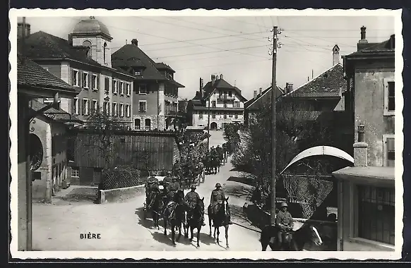 AK Biere, Strassenpartie mit Gebäudeansicht u. Soldaten in Uniformen auf Pferden