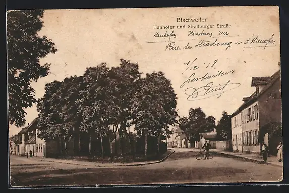 AK Bischweiler, Hanhofer und Strassburger Strasse mit Radfahrer
