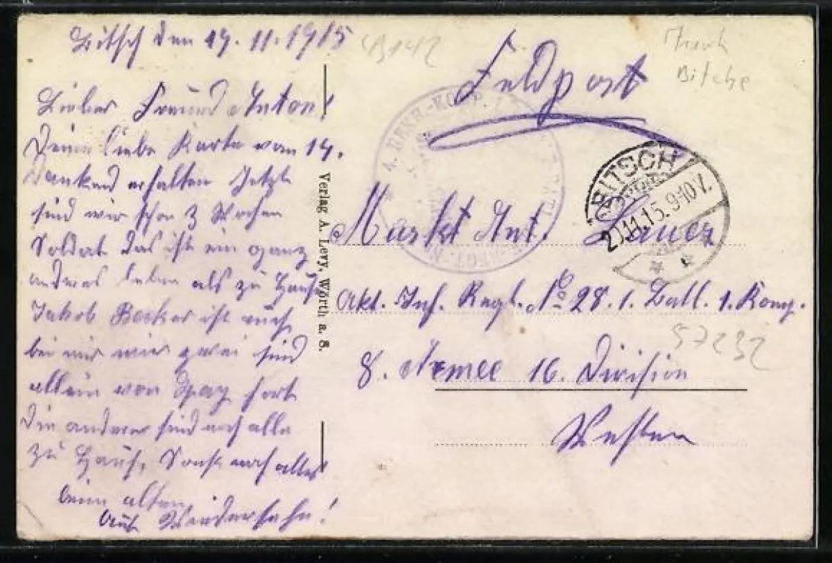 alte Ansichtskarte, gelaufen 1915, Bugspuren mittig, guter Zustand