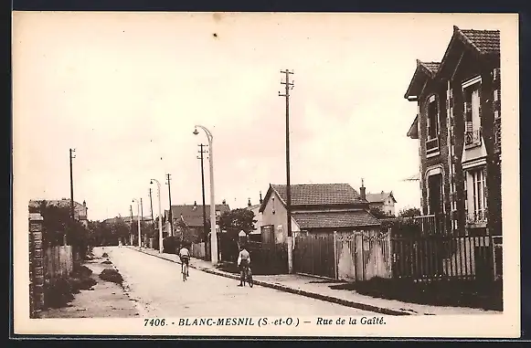 AK Blanc-Mesnil, Rue de la Gaieté avec cyclistes et maisons alignées