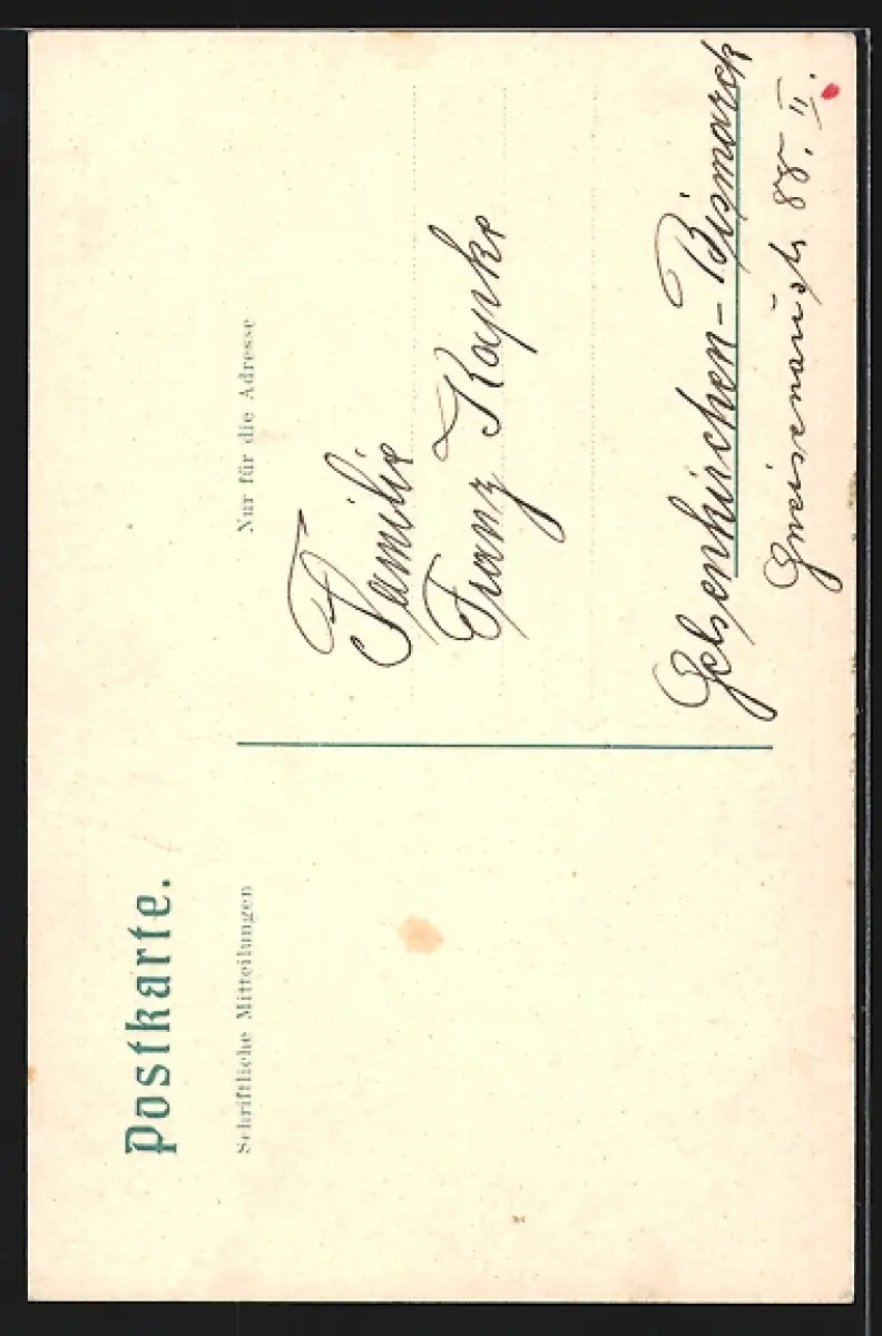 Personenbezogene Daten auf der Rückseite der Karte wurden durch blauen Textmarker unkenntlich gemacht. Die blauen Stellen sind auf die Vorderseite durchgeweicht und wirken sich negativ auf das Postkartenfoto aus