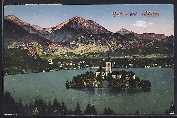 AK Bled-Veldes, Ortspanorama mit vorgelagerter Insel