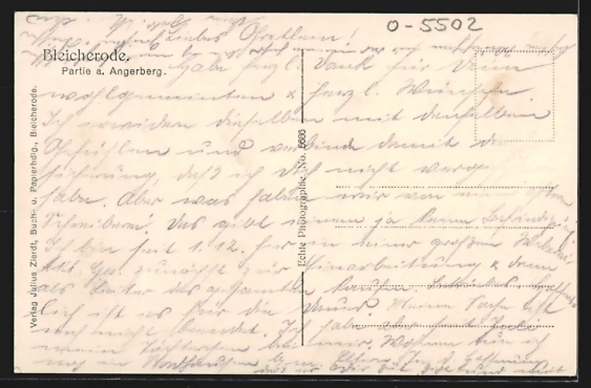 Personenbezogene Daten auf der Rückseite der Karte wurden durch blauen Textmarker unkenntlich gemacht. Die blauen Stellen sind auf die Vorderseite durchgeweicht und wirken sich negativ auf das Postkartenfoto aus