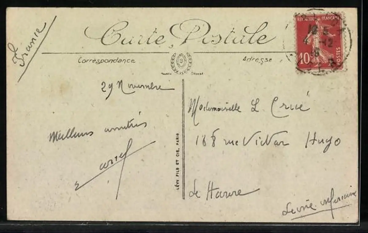 Personenbezogene Daten auf der Rückseite der Karte wurden durch blauen Textmarker unkenntlich gemacht. Die blauen Stellen sind auf die Vorderseite durchgeweicht und wirken sich negativ auf das Postkartenfoto aus