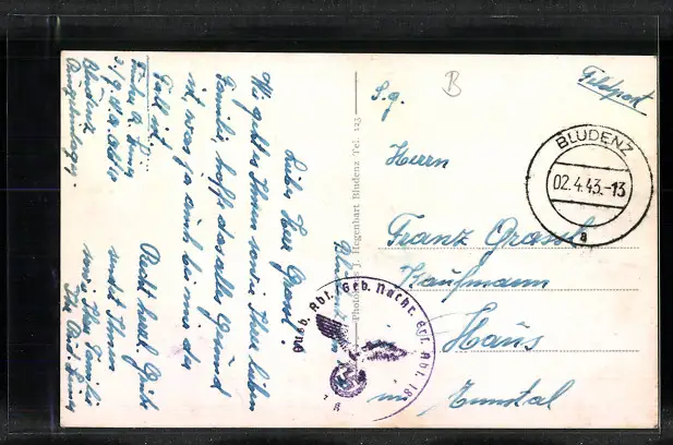 Personenbezogene Daten auf der Rückseite der Karte wurden durch blauen Textmarker unkenntlich gemacht. Die blauen Stellen sind auf die Vorderseite durchgeweicht und wirken sich negativ auf das Postkartenfoto aus