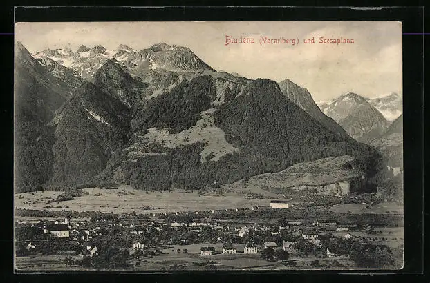 AK Bludenz, Ortsansicht mit Blick auf Scesaplana
