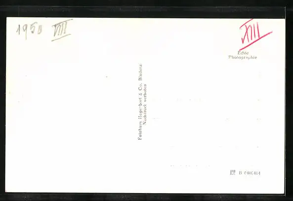 Personenbezogene Daten auf der Rückseite der Karte wurden durch blauen Textmarker unkenntlich gemacht. Die blauen Stellen sind auf die Vorderseite durchgeweicht und wirken sich negativ auf das Postkartenfoto aus