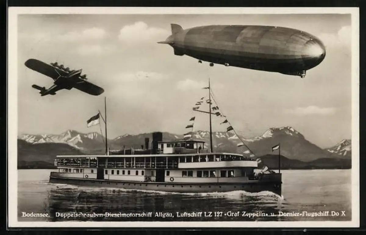AK Bodensee, Doppelschrauben-Dieselmotorschiff, Luftschiff LZ 127 Graf Zeppelin u. Dornier Flugschiff Do X
