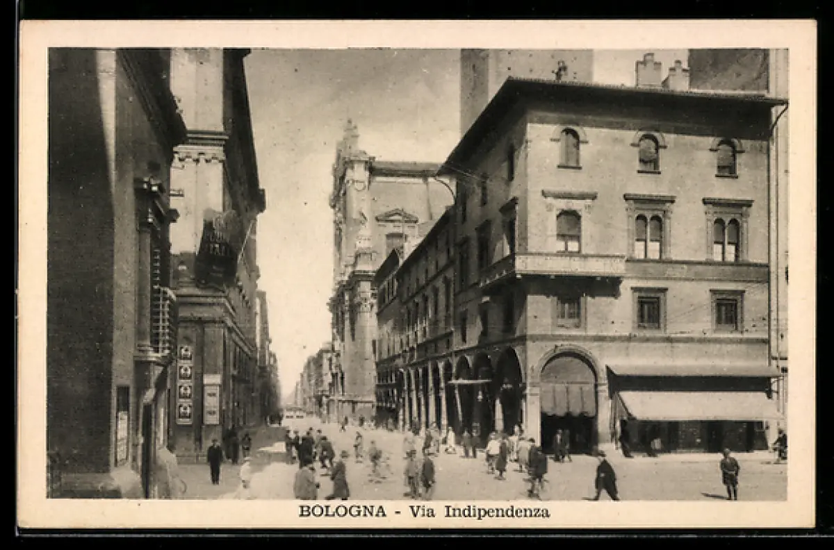 AK Bologna, Via Indipendenza con edifici e passanti