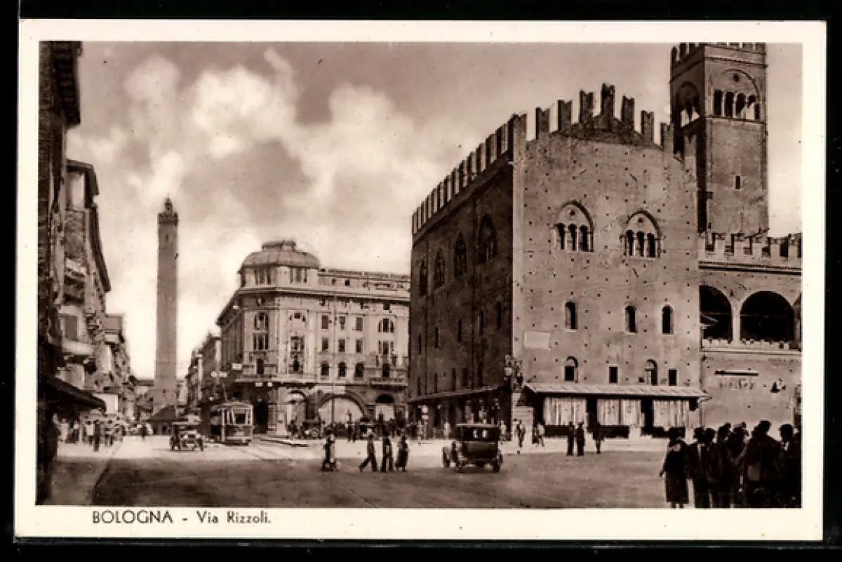 AK Bologna, Via Rizzoli, Torre, Strassenbahn