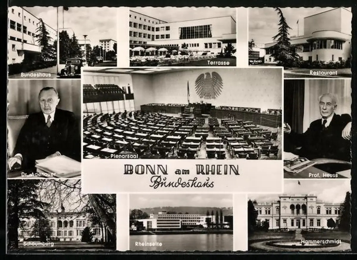 AK Bonn, Bundeshaus, Dr. Adenauer, Prof. Heuss, Schaumburg und Hammerschmidt, BRD