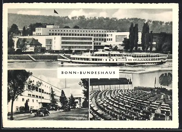 AK Bonn, Bundeshaus, Strassen-, Innen- u. Rheinansicht