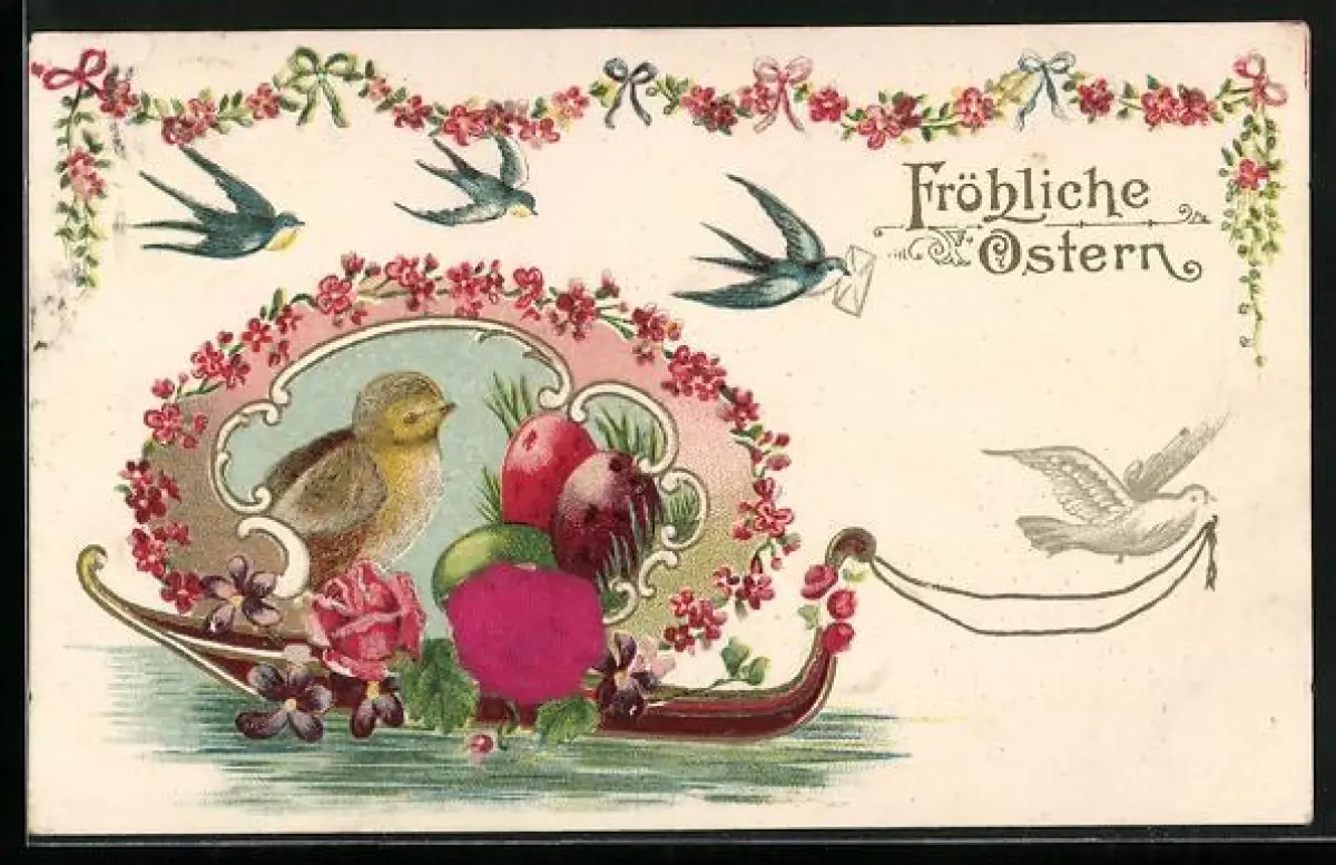 AK Boot mit Ostereiern und Küken, Fröhliche Ostern