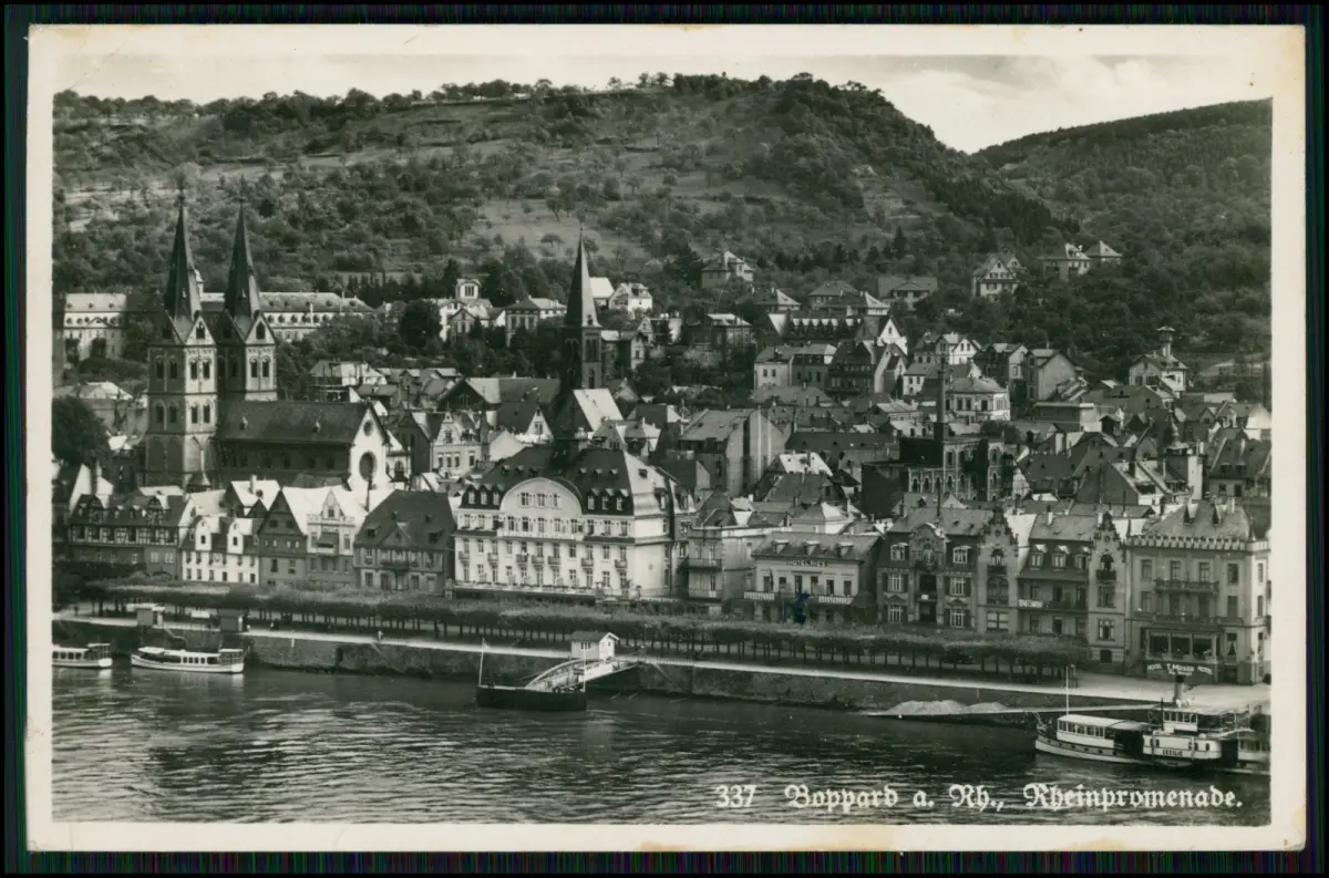 Boppard am Rhein – stimmungsvolles Panorama mit Blick auf die Rheinpromenade und die eindrucksvolle Altstadt. Im Vordergrund liegt das Ausflugsschiff „Cecilie“, dahinter die mächtige Kirche St. Severus mit ihren Doppeltürmen. Im Hintergrund erhebt sich das bewaldete Rheintal mit typischer Weinberglandschaft. Aufnahme aus den 1930er Jahren, Verlag Fritz Wagner, Heimbach-Weis.