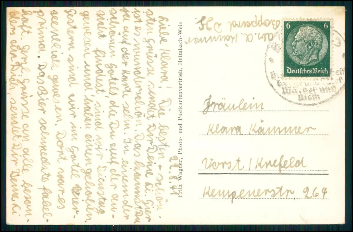 Mit handschriftlichem Text, Poststempel Boppard a. Rh., frankiert mit 6-Pfennig-Marke „Deutsches Reich“. An Fräulein Klara Kämmer, Vorst bei Krefeld, adressiert.