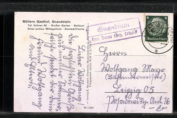 Personenbezogene Daten auf der Rückseite der Karte wurden durch blauen Textmarker unkenntlich gemacht. Die blauen Stellen sind auf die Vorderseite durchgeweicht und wirken sich negativ auf das Postkartenfoto aus