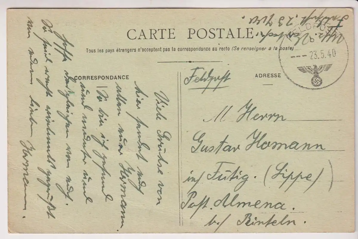 Bemerkungen: Beschriebene Postkarte mit leichten Gebrauchsspuren. Postkarte ohne Briefmarke und mit Stempel (gelaufen). Bitte beachten Sie auch unsere Abbildungen. // Feldpostkarte