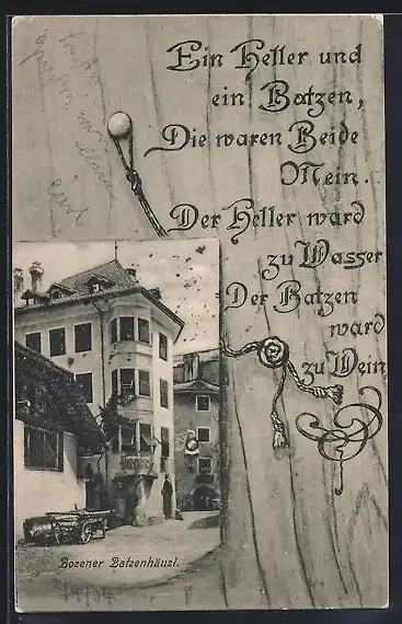 AK Bozen, Bozener Batzenhäusl im Passepartout mit Reim