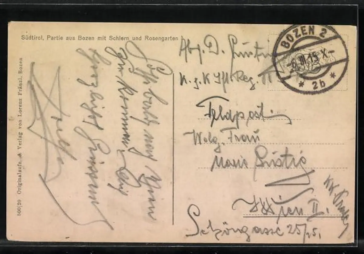 AK Bozen, Ortsansicht mit Schlern und Rosengarten