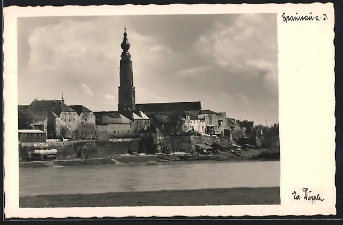 AK Braunau a. I., Ortspanorama mit Turm vom Inn aus
