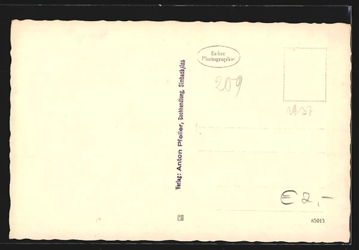 Personenbezogene Daten auf der Rückseite der Karte wurden durch blauen Textmarker unkenntlich gemacht. Die blauen Stellen sind auf die Vorderseite durchgeweicht und wirken sich negativ auf das Postkartenfoto aus