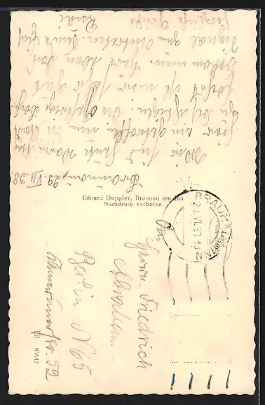 gelaufen 1938, kl. Einriss oben li., Briefmarke entfernt, Stempelspur, guter Zustand